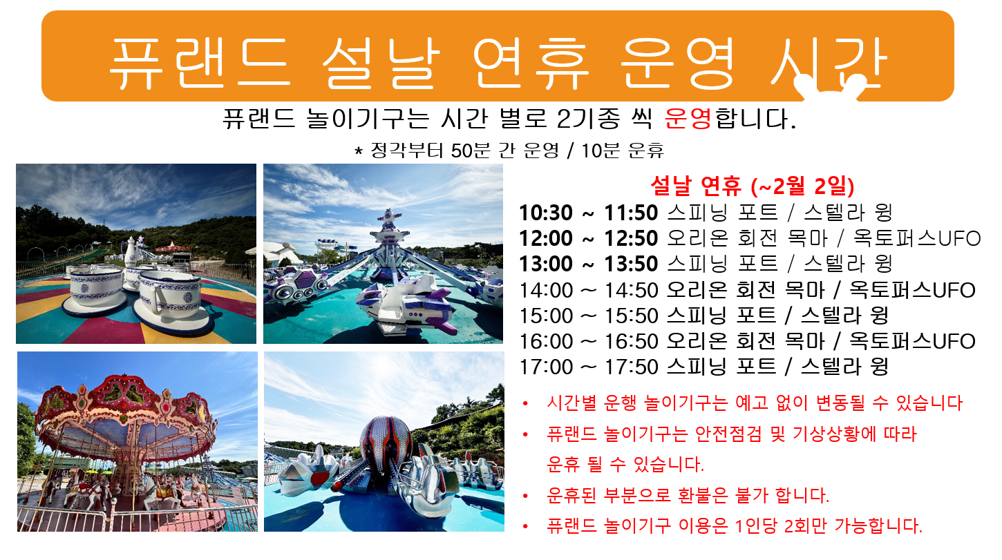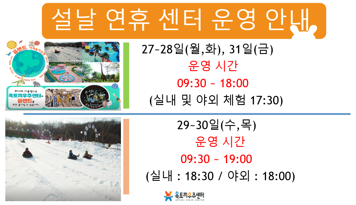 25년 설날 연휴 센터 운영 시간 및 야외 퓨랜드(놀이기구) 운영 시간 안내 해드립니다